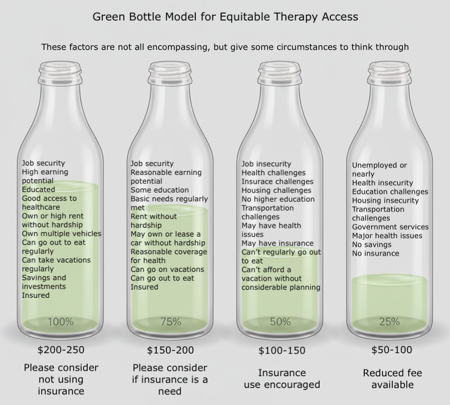 The realities of capitalism are complex and can feel overwhelming, creating vast disparities in access and opportunity. Capitalism is very real, and it has an impact on mental health for all of us. As a provider, I am acutely aware of these complex pressures. While I wish that we could separate the need for help from the need for payment, I know that's not our reality in our current paradigm. This sliding scale is an honest acknowledgement of that tension. It is a way to honor your unique circumstances while providing an empowering path forward.